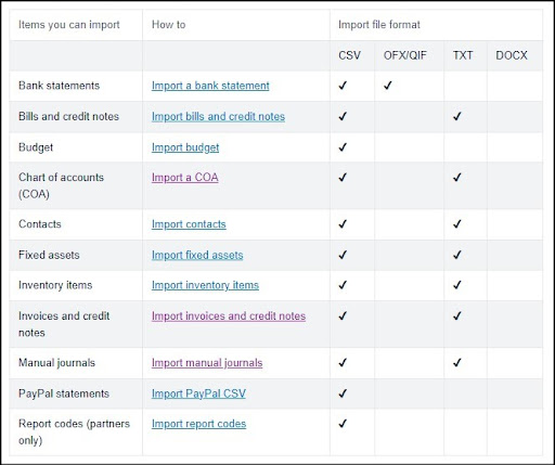 The restore process is manual and allows you to extract the data you need from Xero Backup and import that into your Xero account. The below table shows the file formats that Xero supports for various items;